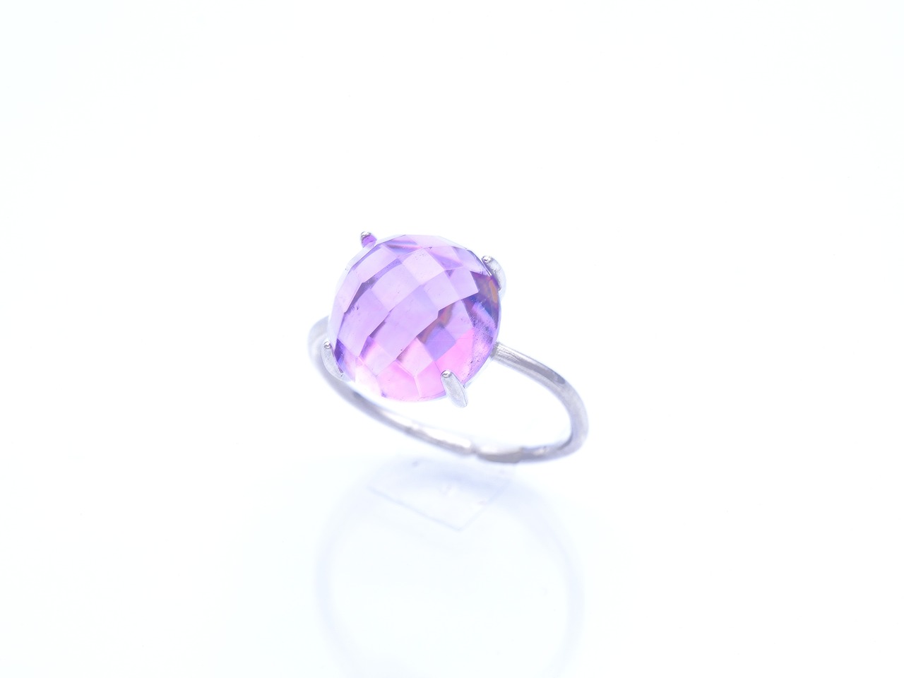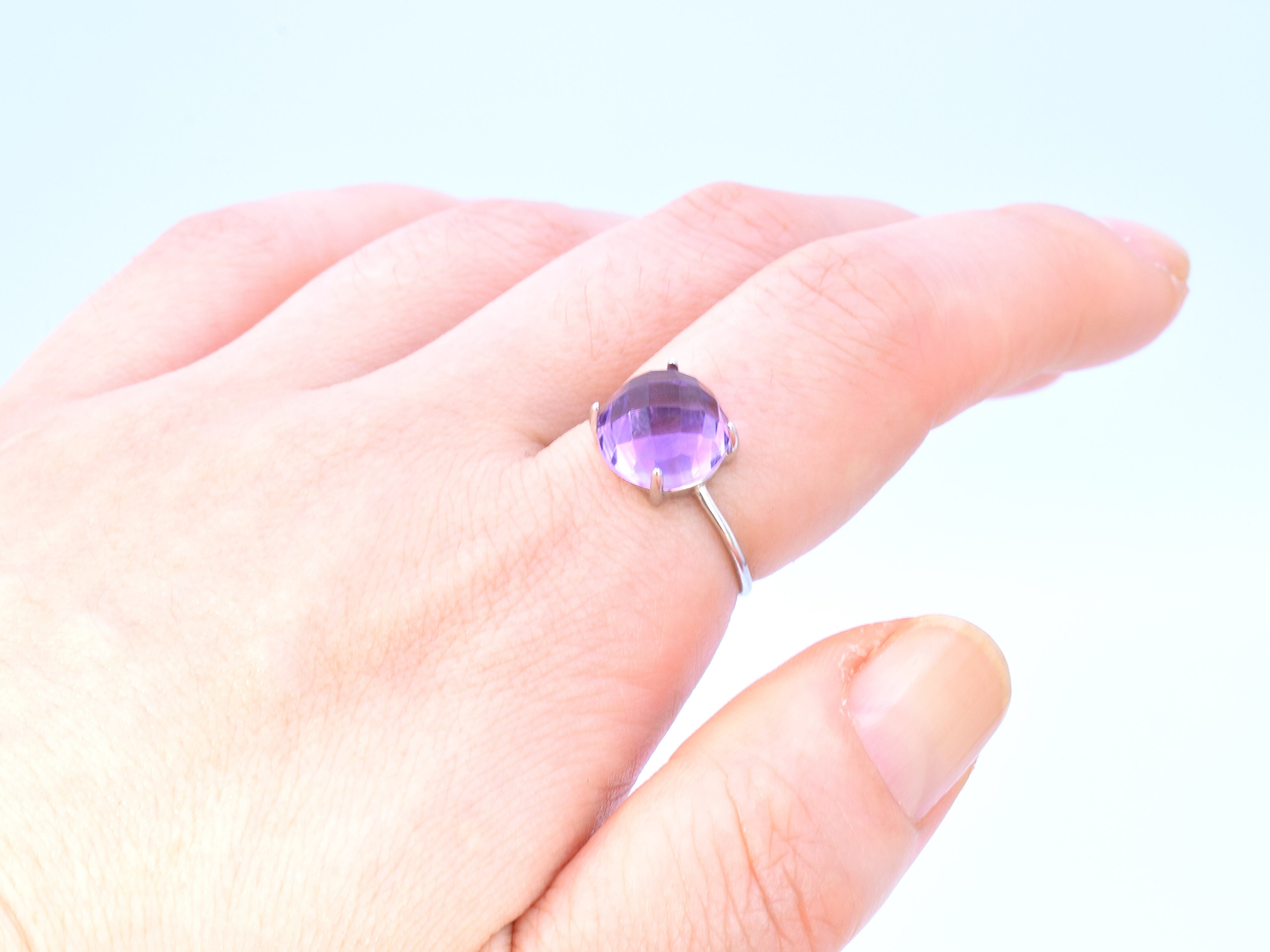 ぷっくりとふくらみが可愛らしく、カット面がキラキラ輝いて透明感が朝露の様に瑞々しい、宝石質アメジストリングです。